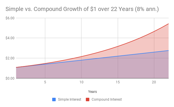To further illustrate the power of compounding over simple returns, you’d have to earn a 20% return a year with simple interest ($0.20 x 22 years = $4.44) to match the performance of the turbocharged, compounded 8% returns. And, believe me when I say that 8% compounded returns are a totally achievable while 20% simple returns are unheard of. It just ain’t happenin’.